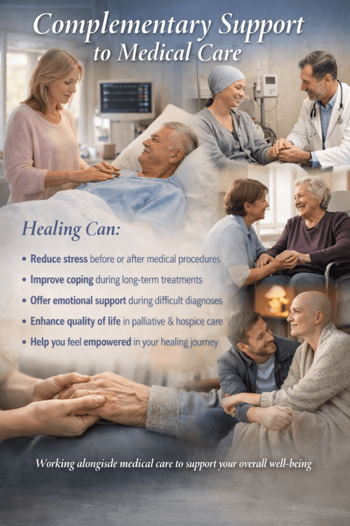 Healing does not “treat” disease directly; instead, it supports the inner equilibrium that allows the body’s natural healing processes to function more effectively. Many clients in hospitals, hospices, cancer centres, and rehabilitation settings find that healing eases discomfort, reduces side effects of treatments, and enhances overall quality of life.
